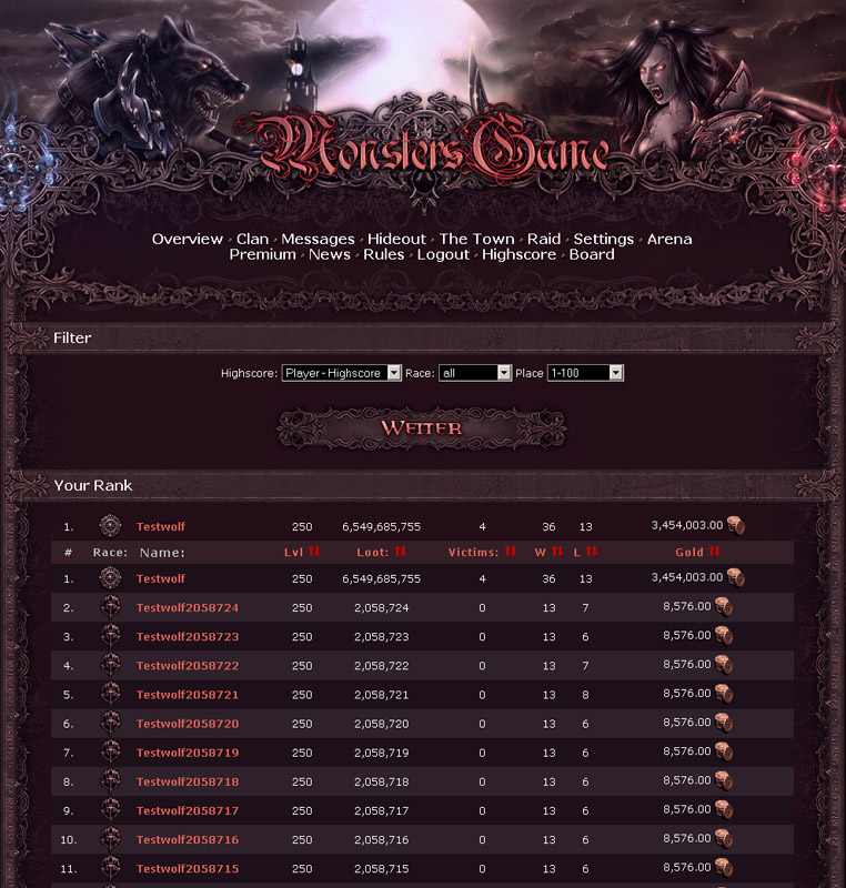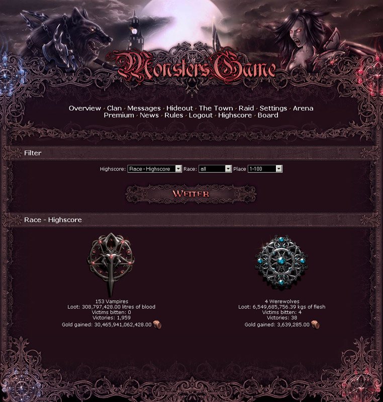 Zde je možné najít tabulku nejúspěšnějších vlkodlaků/upírů a klanů, stejně jako i znesvářených stran. Také je možné vyhledat statistiky setříděné podle různých kritérií. Pravidla hry